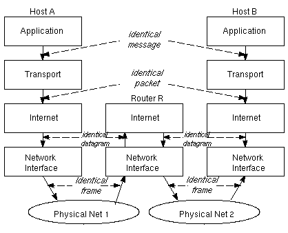 The layering principle when a router is used. The frame delivered to router R is exactly the frame sent from host A, but differs from the frame sent between R and B |