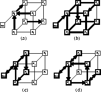 This animation is clear and understandable. In spite of the fact that it is not logically equivalent to the actual execution trace (queries appear to arrive at some processes out of order), it enables the programmer to easily comprehend relevant aspects of program behavior. In this case, it enabled us to discover a bug that was not apparent in the original animation: in Figure 4d, a query crosses a dimension of the cube twice indicating an error in the routing of messages. Thus, ignoring some temporal orderings in the original execution sequence made it possible for the programmer to understand aspects of the program's behavior relevant to its correctness.